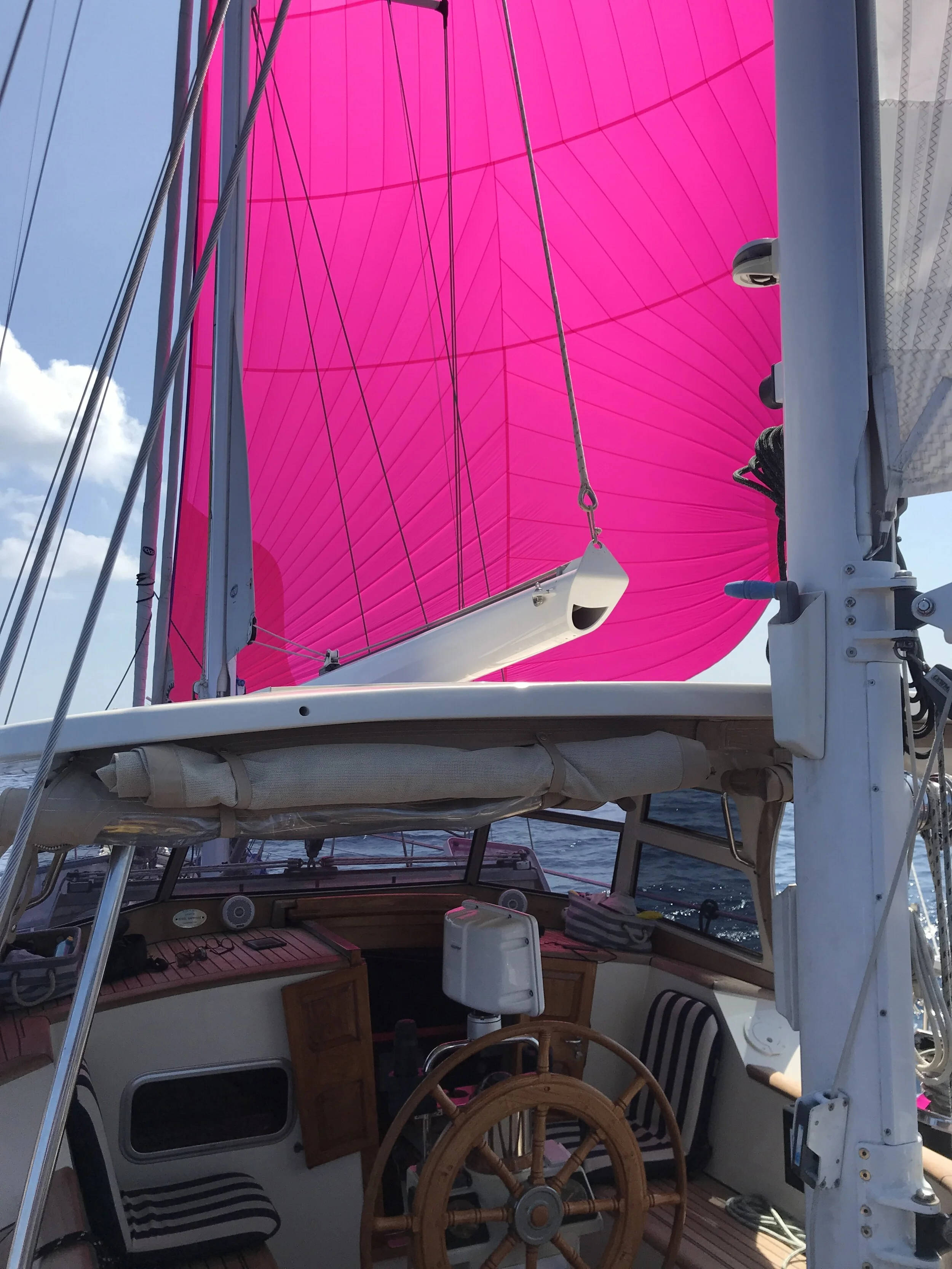 About two hours later, our beautiful spinnaker “Big Pink” turned into more of a Big Gulp as it got stuck at the top of the mast